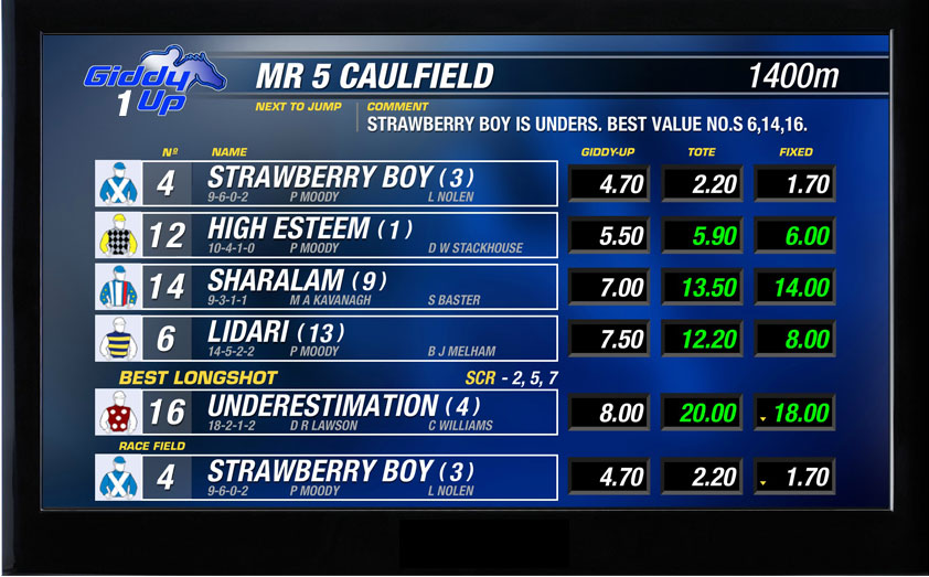 Our analysts have access to a comprehensive database of over two million records and use Giddy-Up’s sophisticated form analysis software to assess each horse’s historical form. They look for horses who are likely to be peaking in form for today’s race and who are suited by today’s conditions. The final step, taking everything into account, is to provide an assessed price (or rating) for each horse in the race.